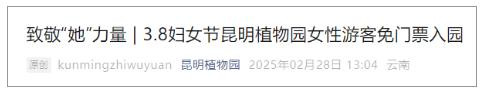 据“昆明植物园”微信公众号消息,昆明植物园于2025年3月8日(星期六)对所有女性游客免费入园游览,详情如下: